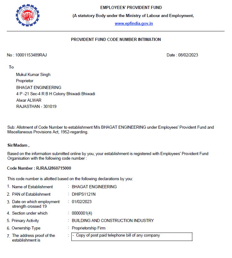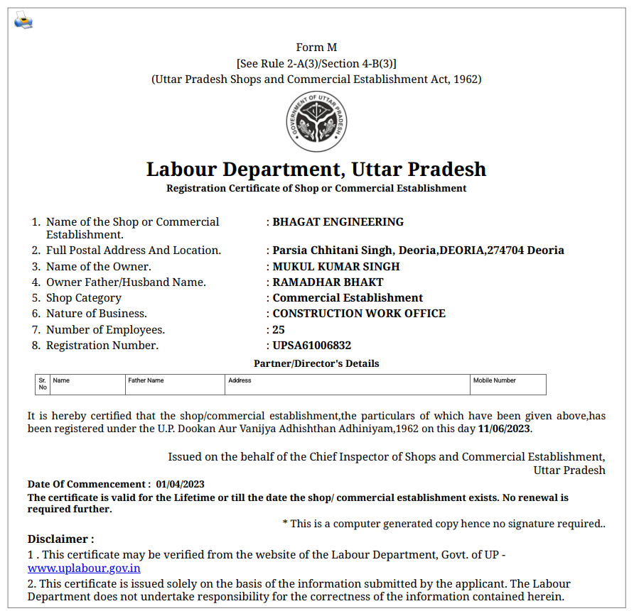 Registration Certificate of Shop or Commercial Establishment