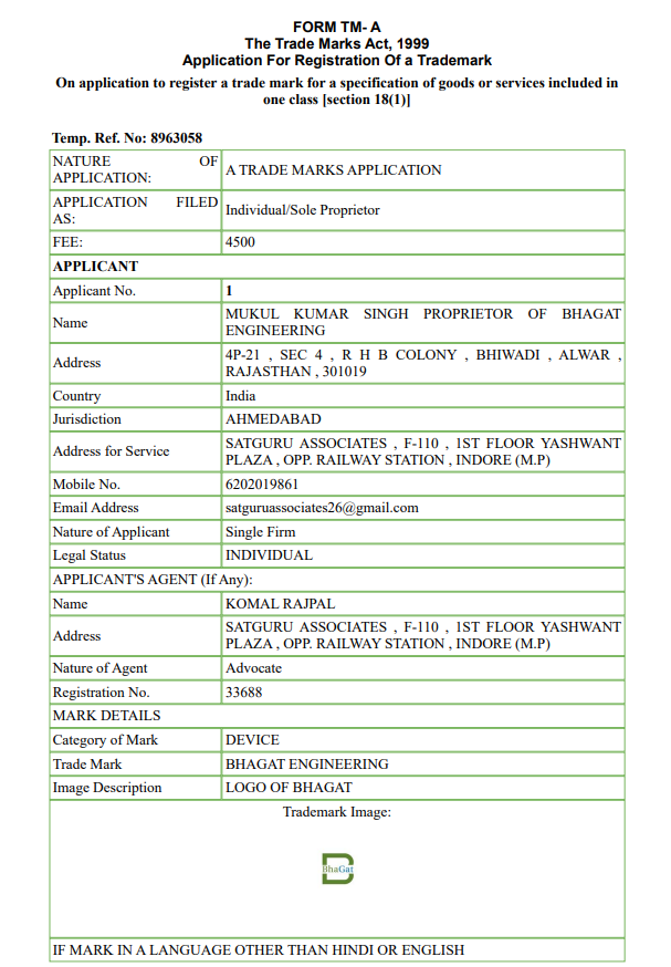 Registration Certificate of Bhagat Engineering Logo